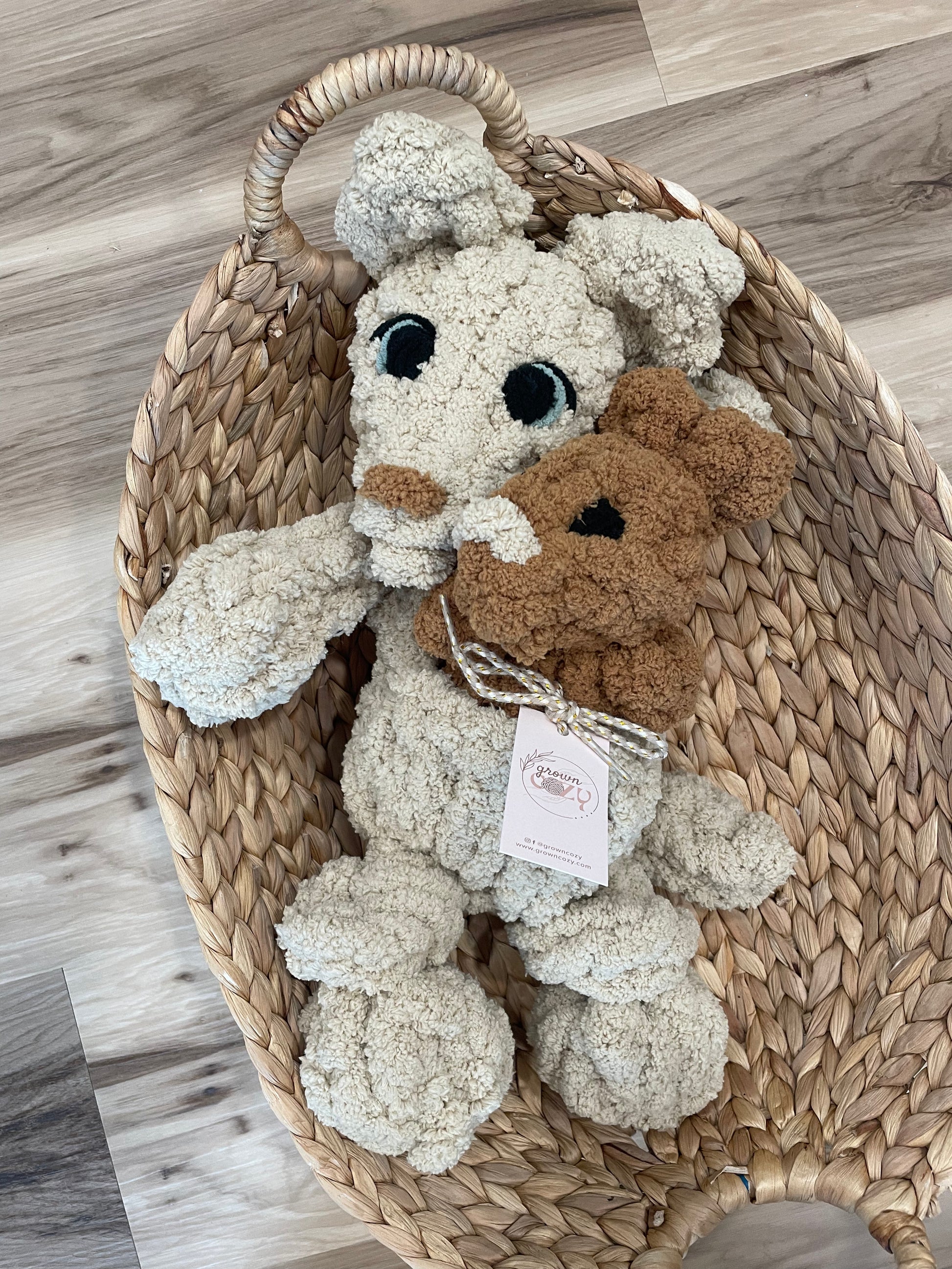 These cozy chunky knit snugglers are the perfect soft companion for little ones. Each snuggler is handmade using ultra-soft chunky polyester yarn, giving them a plush, cuddly texture that’s perfect for snuggling, gifting, or nursery decor.